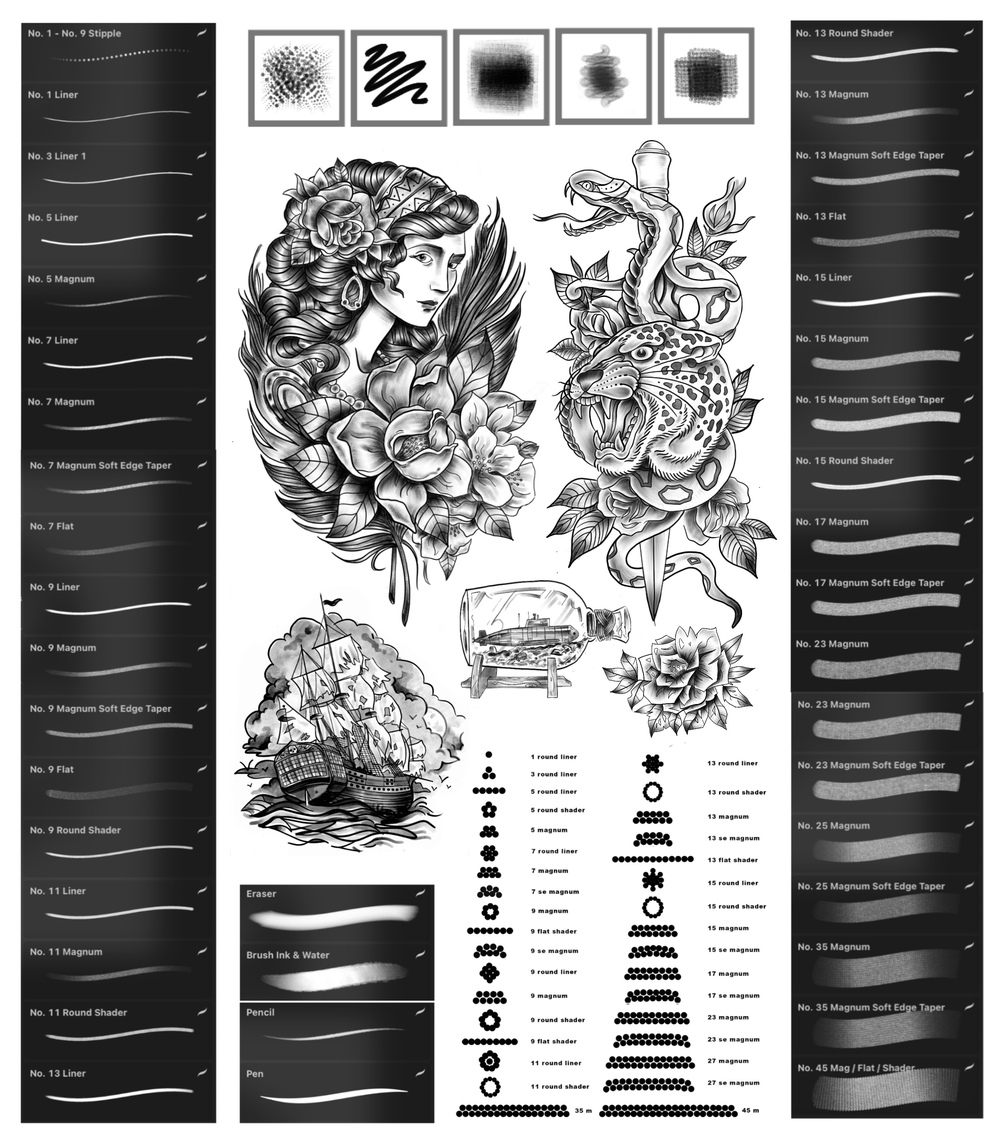 Procreate brush set made to mimic the look & feel of tattoo needles in skin. The set includes all the liners, round line shaders, flat shaders and magnum needle sizes available in any good tattoo supply store. It also includes a pencil, pen, natural eraser and diluted ink in water brushes on heavy cartridge for traditional media flash.